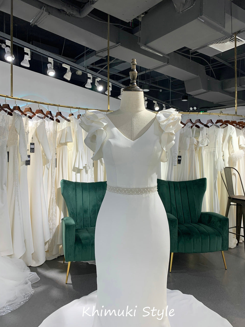 Long Train Fit and Flare Ruffle Sleeve Wedding Dress