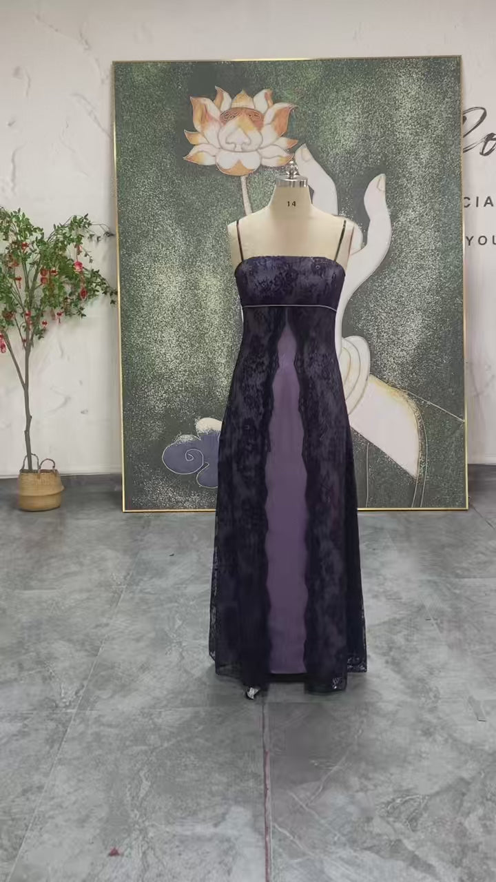 90s Vintage Purple Prom Dress, Spaghetti Strap Lace Party Dress