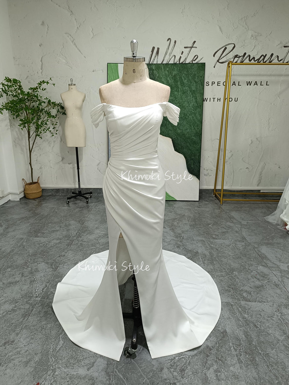 Fit and Flare Off Shoulder Sleeve Wedding Dress,Sexy Slit Wedding Dress