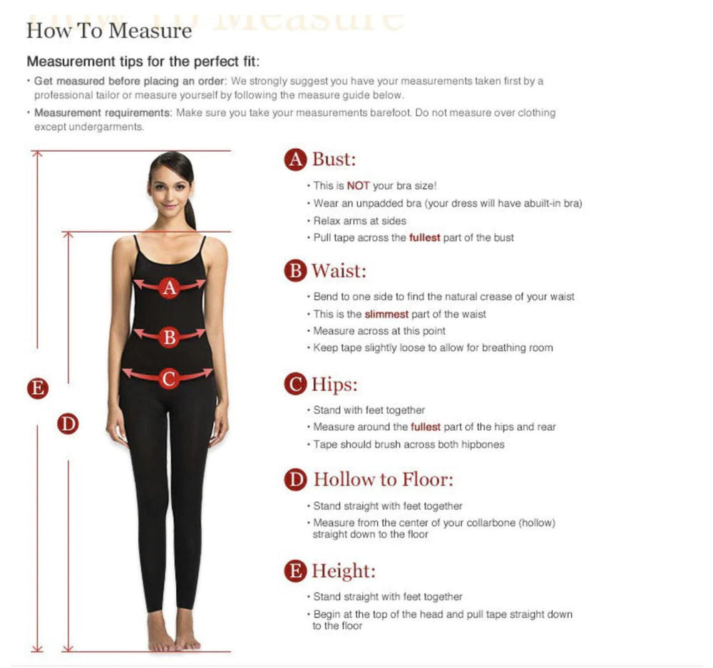 • All of our Professional Effort and Care is to make Your Dress fit You well and the most important part of providing this is taking the most accurate measurements. That's why, It's very IMPORTANT for us if you follow our measurement instructions.