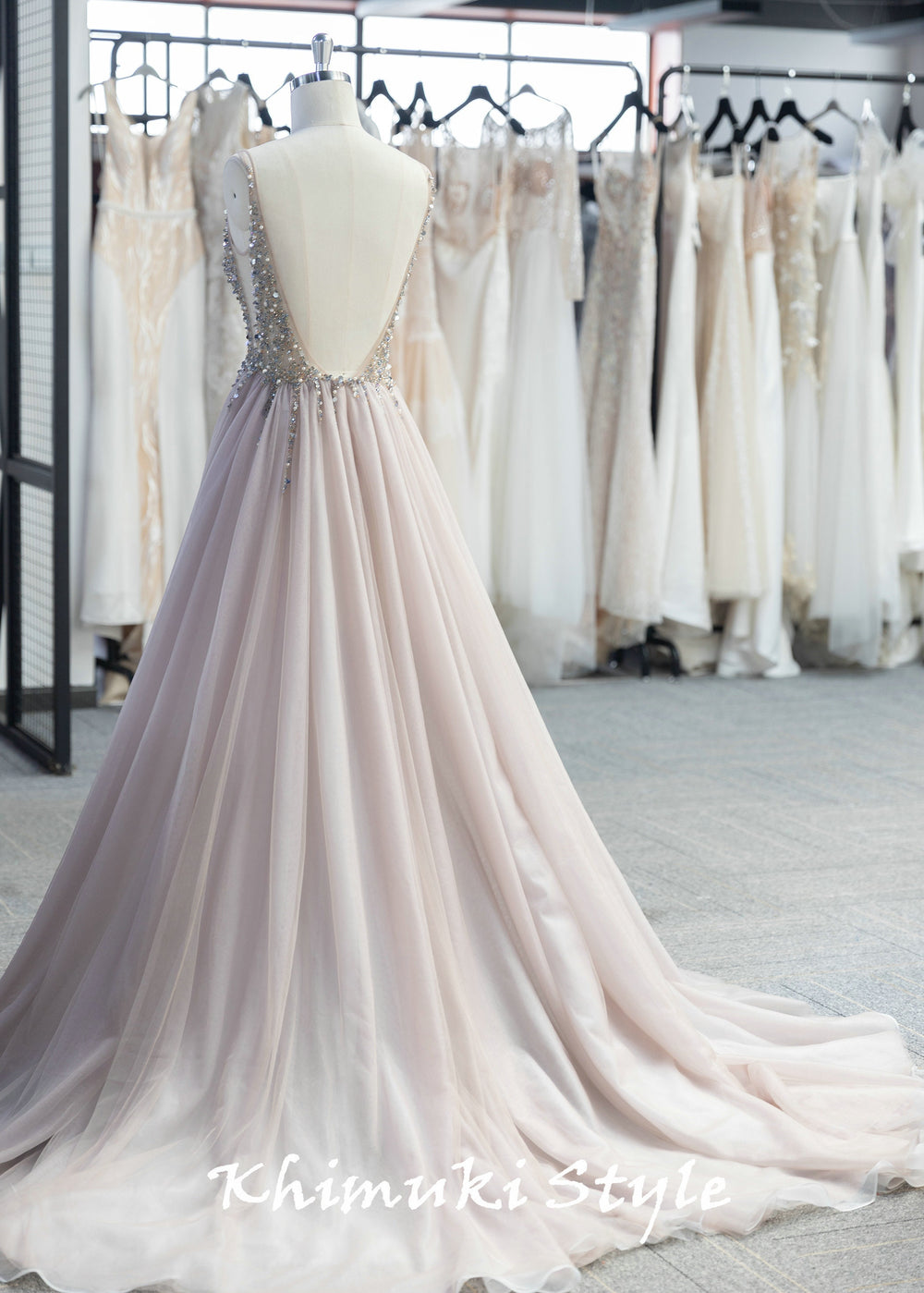 Sexy Low Back Handmade Beaded Blush Tulle Wedding Dress